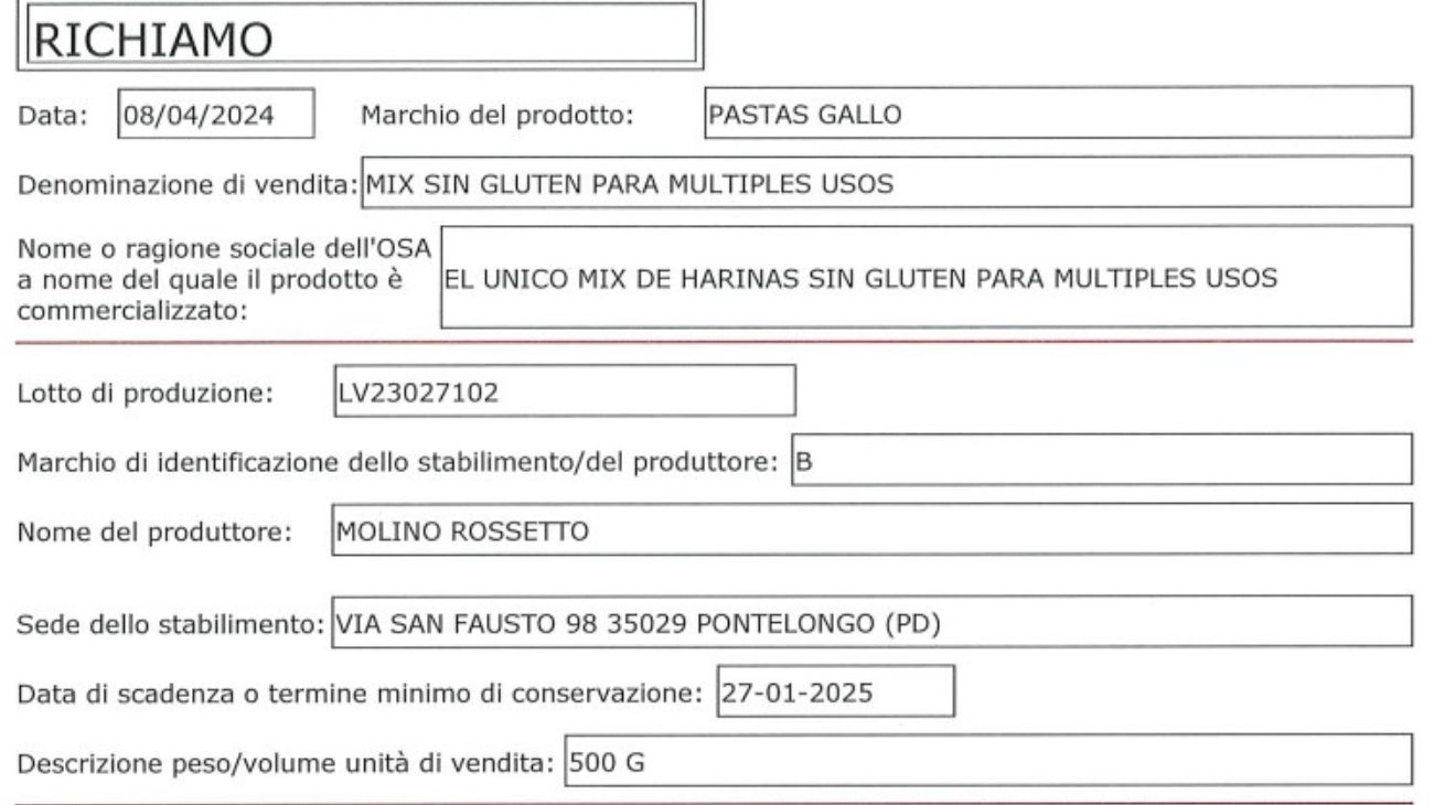 Anche il secondo prodotto oggetto di richiamo alimentare è un preparato senza glutine per usi multipli. In questo caso il marchio del prodotto è Pastas Gallo, venduto in confezioni da 500 grammi, e il lotto di produzione è LV23027102, con data di scadenza 27 gennaio 2025. Questo preparato viene prodotto dallo stesso produttore dell'altro preparato oggetto di richiamo alimentare. ovvero Molino Rossetto con sede nel Comune di Pontelongo. Uguale è anche il motivo del richiamo, ovvero la presenza di allergeni non dichiarata in etichetta. L'avvertenza è quella di non consumare il prodotto e restituirlo al punto vendita.