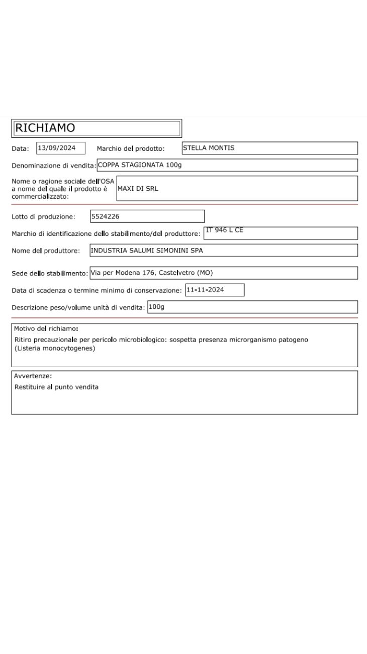 Il primo richiamo riguarda la Coppa Stagionata 90g, a marchio Salumeria del Corso, mentre il secondo riguarda la Coppa Stagionata 100 grammi, a marchio Stella Montis. Il nome o la ragione sociale dell'OSA - Operatore del Settore Alimentare, a nome del quale entrambi i prodotti sono commercializzati, è Maxi Di Srl. Il marchio di identificazione dello stabilimento / del produttore di entrambi i prodotti è IT 946 L CE, mentre il nome del produttore è Industria Salumi Simonini Spa. La sede dello stabilimento di produzione di questi salumi è situata in provincia di Modena, a Castelvetro, ed esattamente in via per Modena, 176.